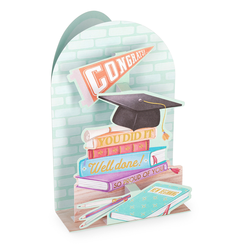 Biglietto Pop Up Graduation Books di Legami: un biglietto d'auguri tridimensionale e creativo, perfetto per celebrare un traguardo importante come la laurea. Con un design unico che raffigura una pila di libri, questo biglietto è ideale per accompagnare un regalo speciale o per esprimere le tue congratulazioni in modo originale.