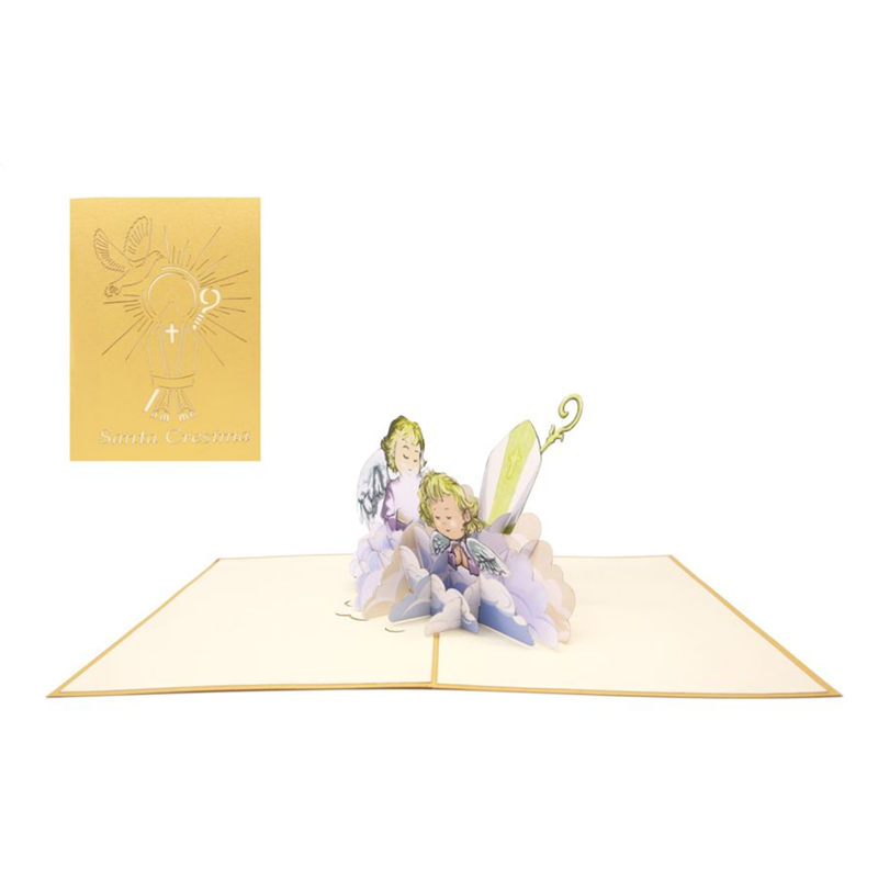 Biglietto auguri kirigami fatto a mano per Cresima, con delicati intagli di angeli. Un'opera d'arte in origami che celebra un momento speciale con eleganza e spiritualità. Perfetto per trasmettere auguri sinceri e unici.