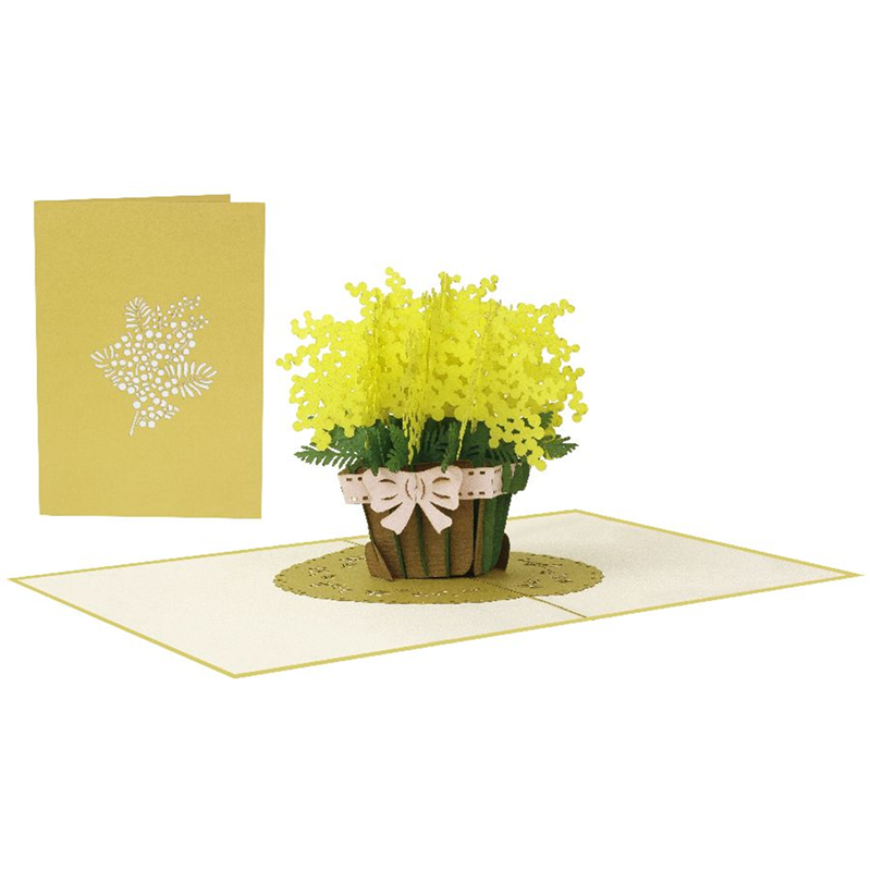 Biglietto di auguri artigianale in stile kirigami, caratterizzato da un elegante design di mimose intagliate. Realizzato a mano con precisione e cura, questo biglietto Origamo è perfetto per celebrare occasioni speciali con un tocco di raffinatezza e creatività.