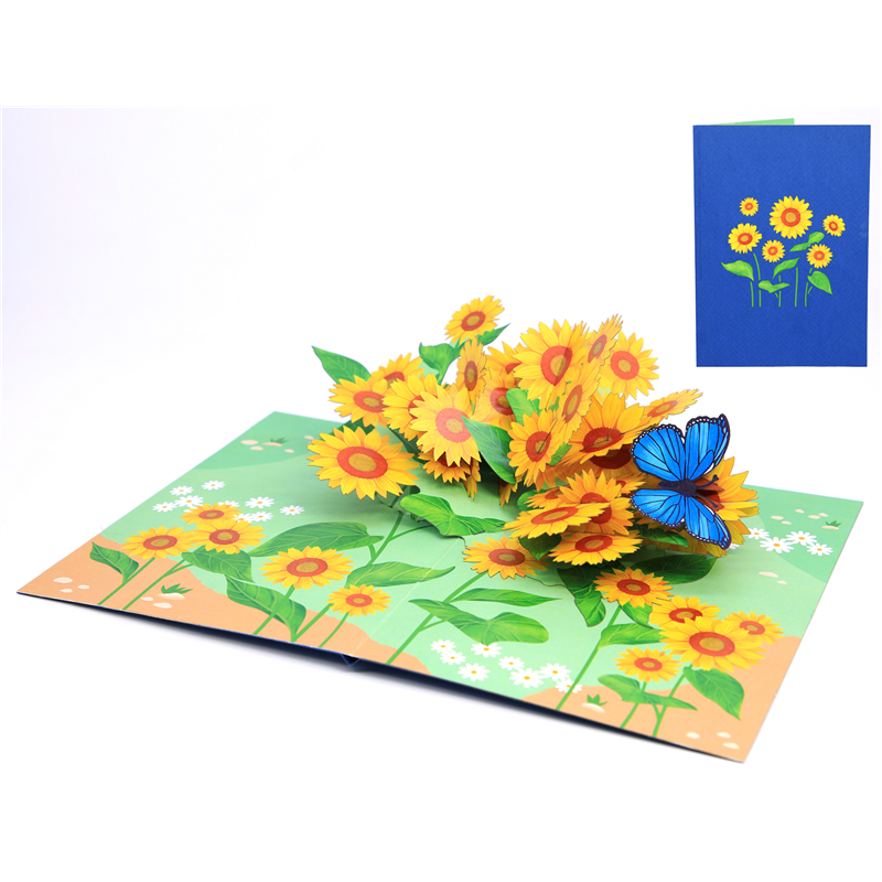 Biglietto d'auguri Kirigami fatto a mano con un design raffinato di girasoli, realizzato da Origamo. Perfetto per esprimere auguri speciali con un tocco artistico e unico.