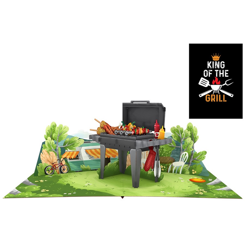 Biglietto di auguri Kirigami fatto a mano "King Of The Grill" di Origamo: un design raffinato e dettagliato che celebra il re del barbecue. Quando aperto, rivela una scena tridimensionale di un barbecue completo di griglia e utensili, perfetto per gli appassionati di grigliate. Realizzato con cura artigianale, è un augurio speciale e unico.