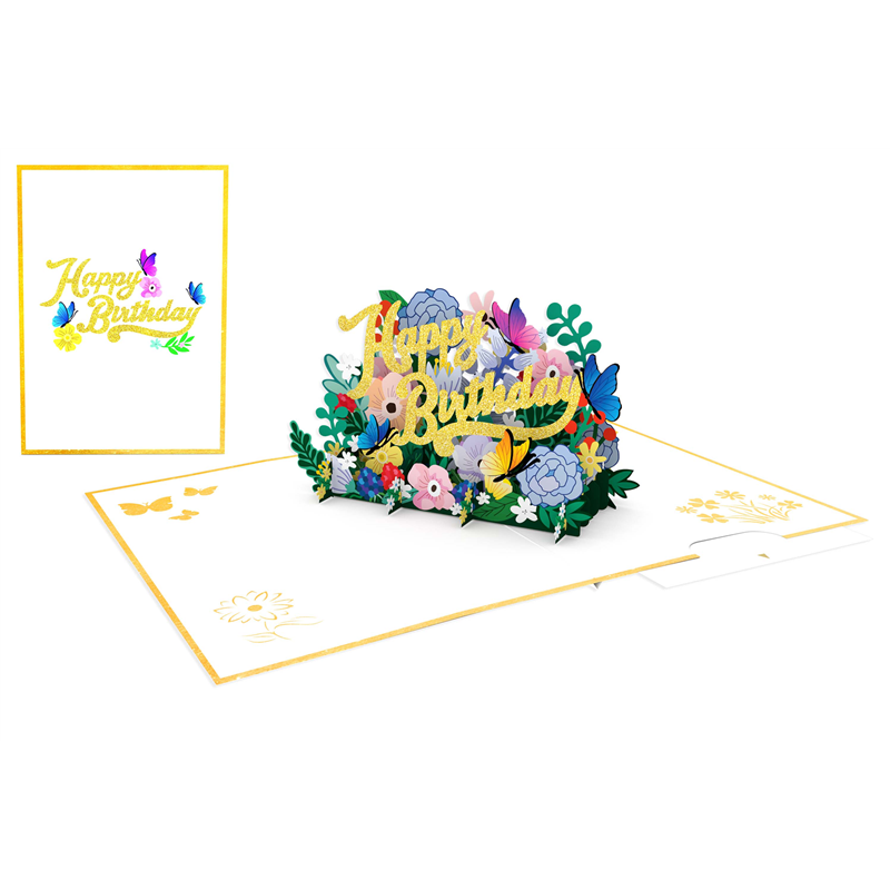 Biglietto di auguri kirigami fatto a mano con design floreale in stile origami, ideale per compleanni. Presenta intricati fiori tridimensionali che si aprono all'apertura del biglietto, creando un effetto sorprendente e sofisticato. Perfetto per esprimere auguri di compleanno in modo unico e artistico.