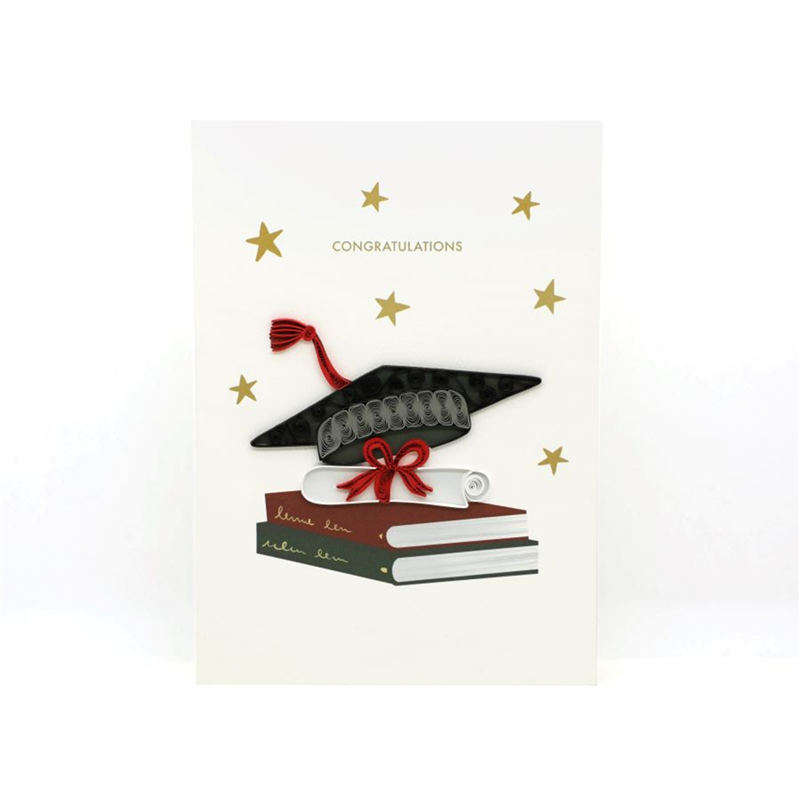 Congratulazioni per la tua laurea! Questo biglietto d'auguri unico, realizzato a mano con la tecnica del quilling, cattura l'eleganza e la gioia di questo momento speciale. Ogni dettaglio è attentamente creato per celebrare il tuo successo e il tuo futuro brillante.