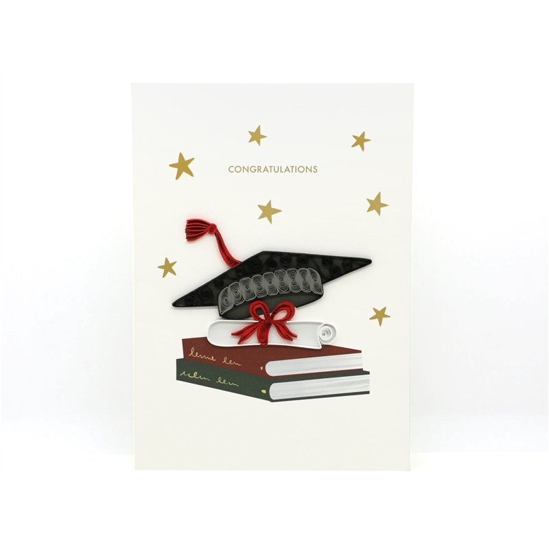 Congratulazioni per la tua laurea! Questo biglietto d'auguri unico, realizzato a mano con la tecnica del quilling, cattura l'eleganza e la gioia di questo momento speciale. Ogni dettaglio � attentamente creato per celebrare il tuo successo e il tuo futuro brillante.