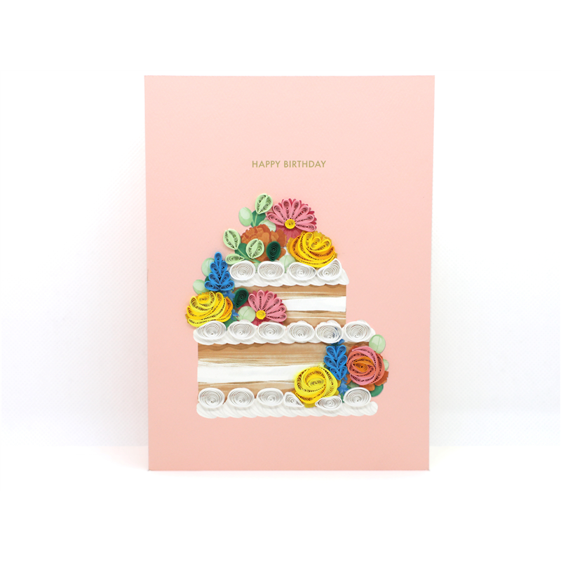 Biglietto d'auguri artigianale con design in quilling, raffigurante una torta floreale. Realizzato con precisione e creativit�, questo biglietto � perfetto per celebrare occasioni speciali con un tocco di eleganza e originalit�. Ogni dettaglio � curato a mano, rendendolo un regalo unico e memorabile.