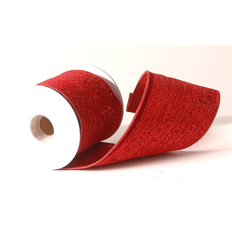 Nastro in velluto con paillettes di colore rosso, dimensioni 10 cm di larghezza per 4,6 metri di lunghezza, ideale per decorazioni eleganti e festive.