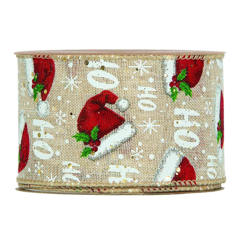 Nastro decorativo natalizio "Ho Ho Ho" con larghezza di 63 mm e lunghezza di 10 metri, parte della Selezione Vertecchi. Decorato con motivi festivi, ideale per confezioni regalo o decorazioni natalizie.