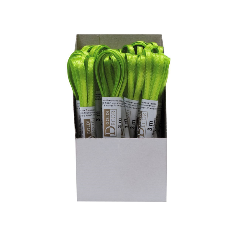 Nastro in doppio raso di colore verde mela, lunghezza 3 metri e larghezza 3 mm, codice colore 551. Prodotto da Goldina, ideale per decorazioni, confezionamento e progetti di fai da te.
