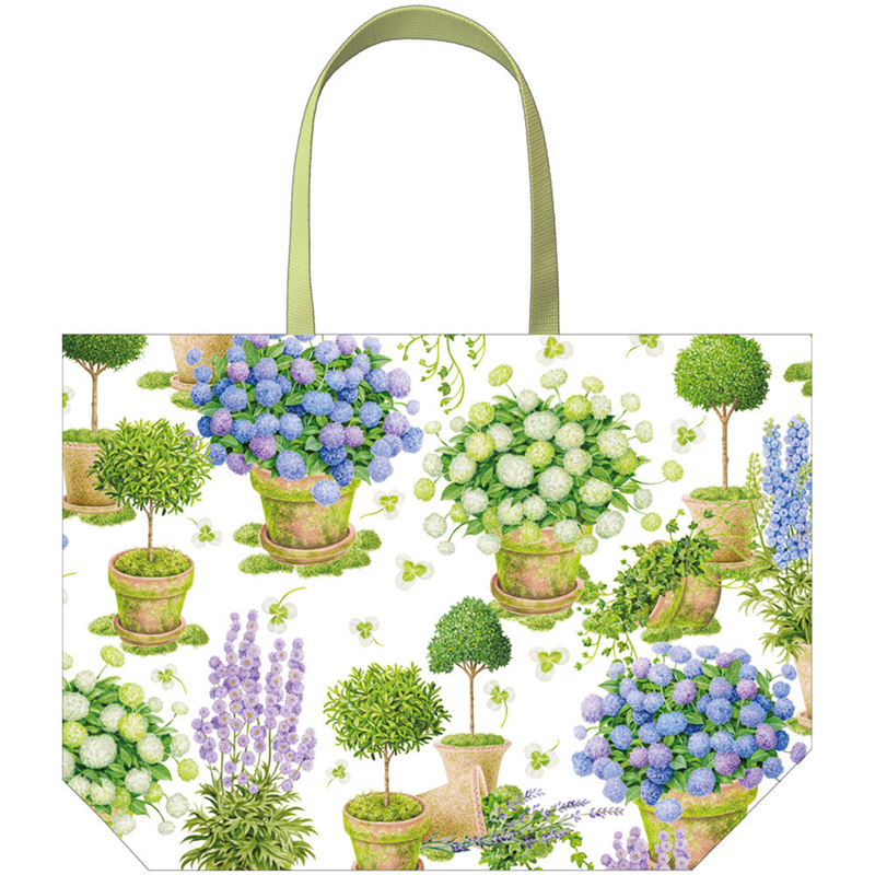 Busta regalo shopper di dimensioni 21,6x14,6x6,4 cm, decorata con un elegante motivo di ortensie in vaso, realizzata da Caspari. Perfetta per aggiungere un tocco di raffinatezza ai tuoi regali.