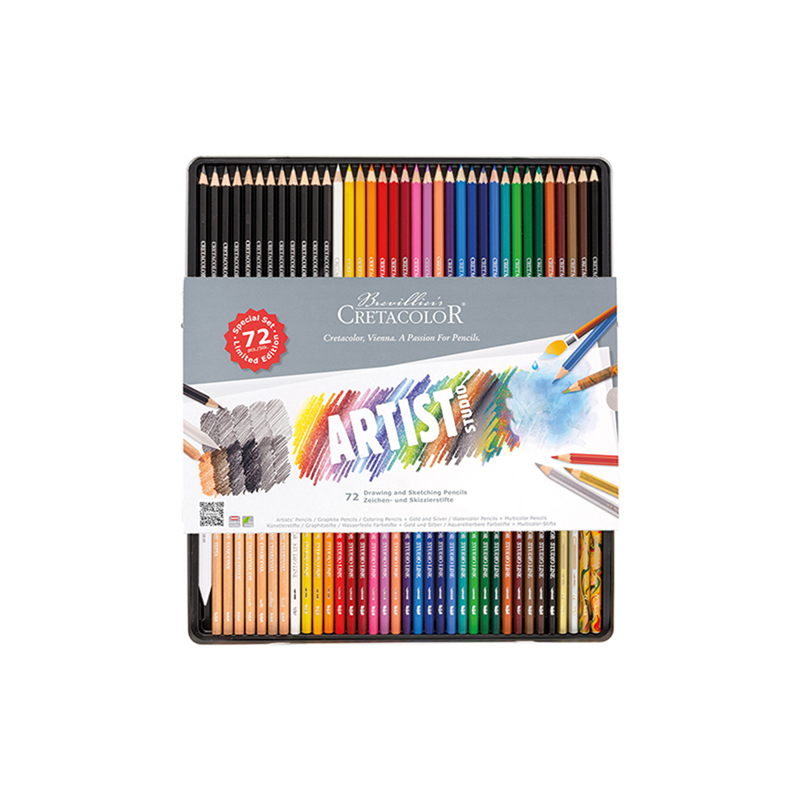 set per disegno e schizzoquesto fantastico set da 72 pezzi contiene una collezionedei principali prodotti artist studio:• 12 matite di grafite(6b, 4b, 3b, 2b, b, 2x hb, f, h, 2h, 3h, 4h)• 7 matite da artista(matite color seppia, sanguigna, gesso bianco e carboncinoin 4 gradazioni: dura, media, morbida eextra morbida a base di olio)• 1 stump• 24 matite colorate idrosolubili• 24 matite colorate permanenti• 2 matite colorate nei colori oro e argento• 2 matite con mine a 4 coloriil set da 72 pezzi è contenuto in una robusta ecaratteristica scatola di latta.