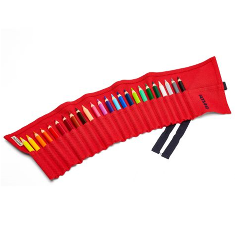 astuccio in misto lino e cotone con nastro di chiusura colorato,realizzato sartorialmente in italia, contenente 24 pastelli acquerellabili a punta grossa ad impugnatura ergonomica. dimensioni 53x16 cm.