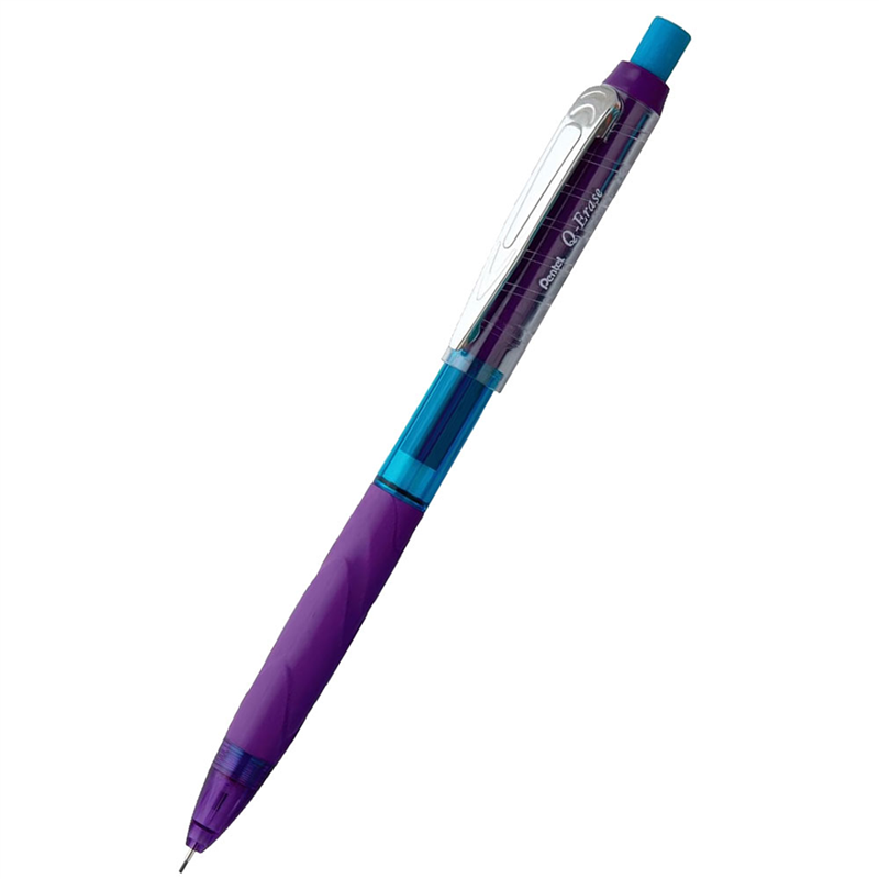 Portamine Pentel Q-Erase 0.5mm Viola: meccanismo a scatto per avanzamento della mina, impugnatura ergonomica in gomma per comfort e controllo, gomma integrata con cappuccio protettivo, corpo in plastica resistente di colore viola, clip da tasca, compatibile con mine di durezza HB o 2B.