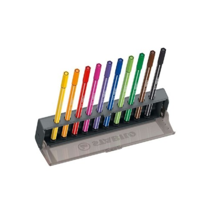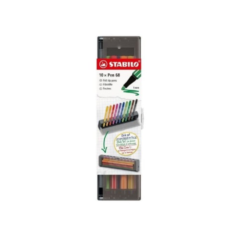 pen 68 click set compatto, pratico, colorato. basta aprire il coperchio e si trasforma in un perfetto espositore.