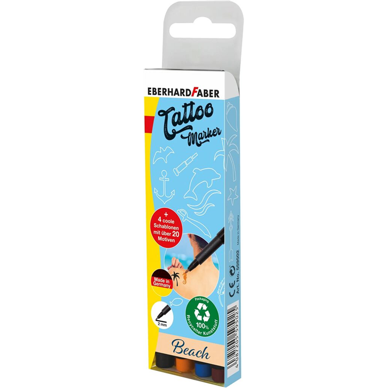 bustina contenente 4 marker per tatuaggi temporanei e stencil con tema beach di eberhard faber. i marker permettono di creare disegni sulla pelle in modo sicuro e resistente all'acqua, ideali per esprimere la creatività durante l'estate. gli stencil inclusi facilitano la realizzazione di disegni precisi e dettagliati, perfetti per divertirsi con amici o in famiglia. colori nero, rosso, blu, verde.