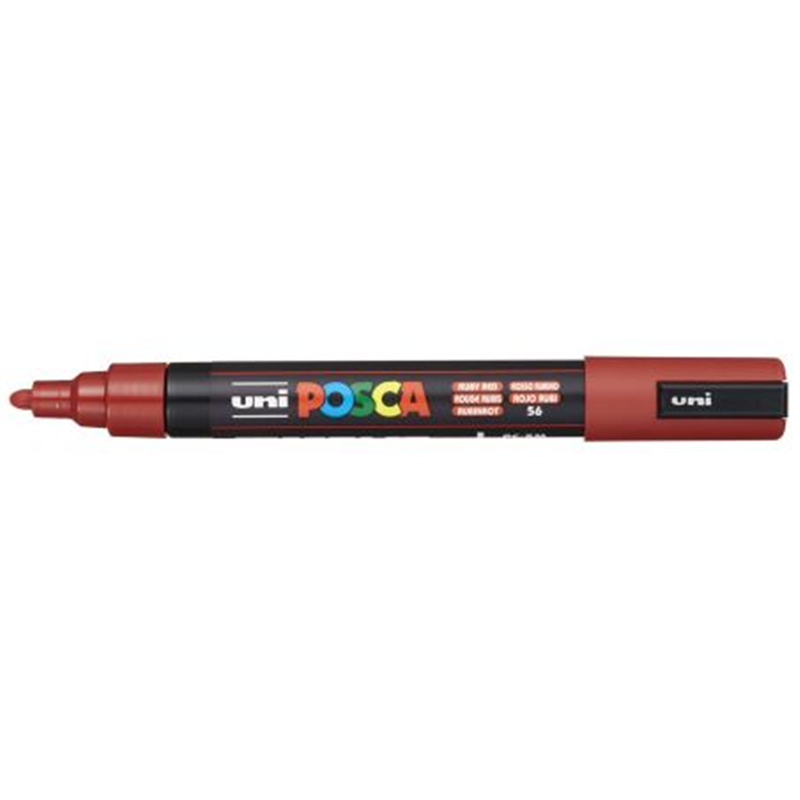 Pennarello Uni Posca Medio RR-Rosso Rubino: Punta conica media da 2,5 mm, in fibra acrilica, ideale per tratti precisi e riempimenti uniformi. Inchiostro a base d'acqua, coprente, resistente alla luce, inodore e privo di alcol e solventi. Adatto a molte superfici, tra cui carta, cartone, tessuti, metalli, legno, plastica, ceramica e vetro. Colore Rosso Rubino, vibrante e intenso. Cappuccio e corpo in plastica resistente con impugnatura ergonomica. Sistema a valvola per un flusso d'inchiostro costante e uniforme. Ricaricabile.