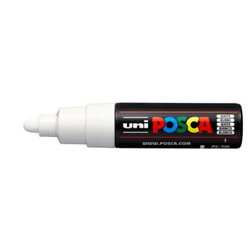 Pennarello Uni Posca Large Bi-Bianco: punta a scalpello larga, ideale per segni spessi e coprenti- inchiostro pigmentato a base d'acqua, opaco e permanente su superfici porose, rimovibile su superfici non porose- adatto per carta, cartone, legno, metallo, tessuto, plastica, vetro- asciugatura rapida, resistente alla luce- privo di odori, non tossico.