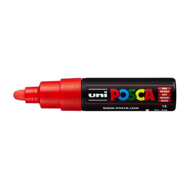 Pennarello Uni Posca Large R-Rosso: punta larga a scalpello da 15 mm, inchiostro a base d'acqua, permanente su superfici porose, rimovibile su superfici non porose, resistente alla luce, atossico, ideale per arte, artigianato e decorazione, corpo in plastica, tappo con chiusura di sicurezza.