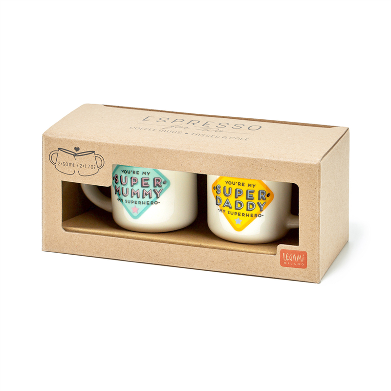Set di 2 tazzine da caff� espresso "Super Mummy" e "Super Daddy" di Legami, perfette per celebrare i super genitori con un design accattivante e un messaggio affettuoso. Realizzate in ceramica di alta qualit�, queste tazzine sono ideali per gustare il caff� espresso insieme, aggiungendo un tocco di amore e gratitudine alla pausa caff� quotidiana. Perfette come regalo per occasioni speciali o semplicemente per dire "grazie" a mamma e pap�.