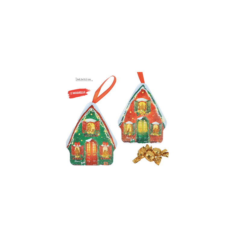 Casetta d'appendere in metallo, perfetta per decorare e deliziare. All'interno, una selezione di cioccolatini pregiati, ideali per un regalo speciale o per aggiungere un tocco dolce alla casa. Il design curato della casetta si abbina a qualsiasi ambiente, rendendola un oggetto versatile e raffinato.