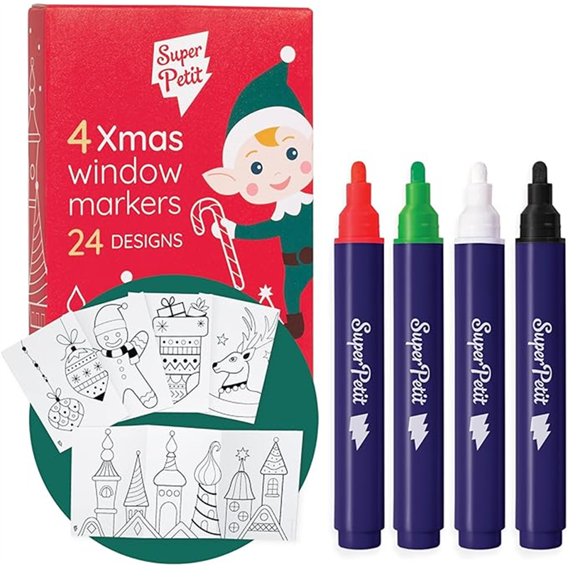 Set di 4 pennarelli speciali per vetri e specchi, perfetti per stimolare la creatività dei bambini. Inclusi 24 disegni cancellabili per un divertimento senza fine. Facili da pulire, non lasciano tracce permanenti e sono sicuri per l'uso da parte dei più piccoli. Ideali per trasformare superfici lisce in tele artistiche temporanee.