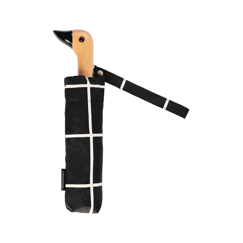 L'Ombrello Duck Head Black Grid di Moroni Gomma Srl è un elegante accessorio caratterizzato da un manico a forma di testa d'anatra e un motivo a griglia nera sul tessuto. Realizzato con materiali di alta qualità, offre resistenza e stile, ideale per proteggersi dalla pioggia con un tocco di classe.