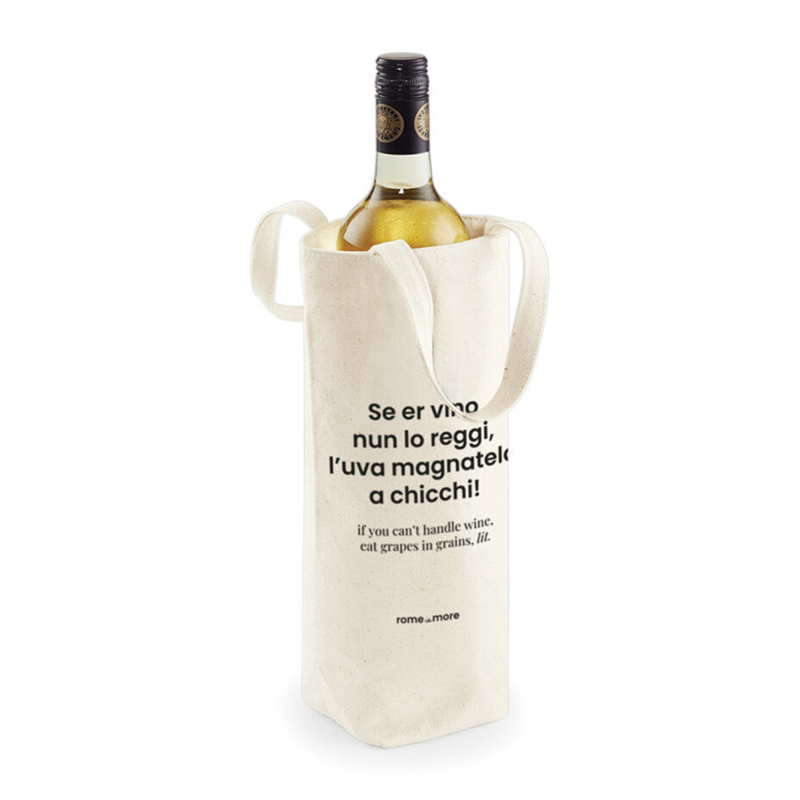 Portabottiglie in tessuto con la scritta "Se Er Vino Nun Lo Regg" della collezione Rome Is More, ideale per trasportare e conservare le tue bottiglie con un tocco di stile romano.