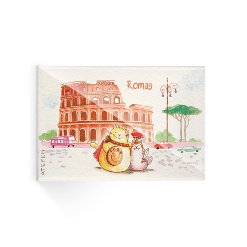 Calamita decorativa 7x5 cm che raffigura il Colosseo di Roma con simpatici gatti vestiti da gladiatori. Parte della Selezione Vertecchi, questa calamita unisce l'iconico monumento storico con un tocco giocoso e originale, ideale come souvenir o regalo per gli amanti di Roma e degli animali.