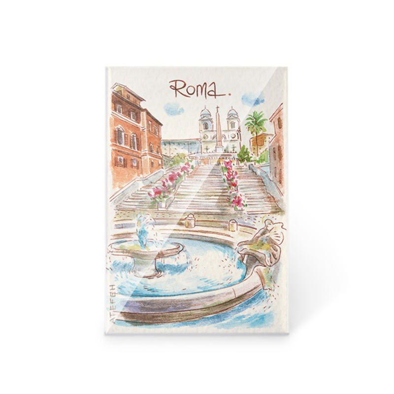 Calamita rettangolare 7x5 cm raffigurante la splendida Piazza di Spagna a Roma in orientamento orizzontale. Parte della selezione Vertecchi, questo souvenir cattura l'essenza della citt� eterna con la sua iconica scalinata di Trinit� dei Monti e la vivace atmosfera circostante. Un ricordo perfetto per chi ama l'arte e la storia di Roma.