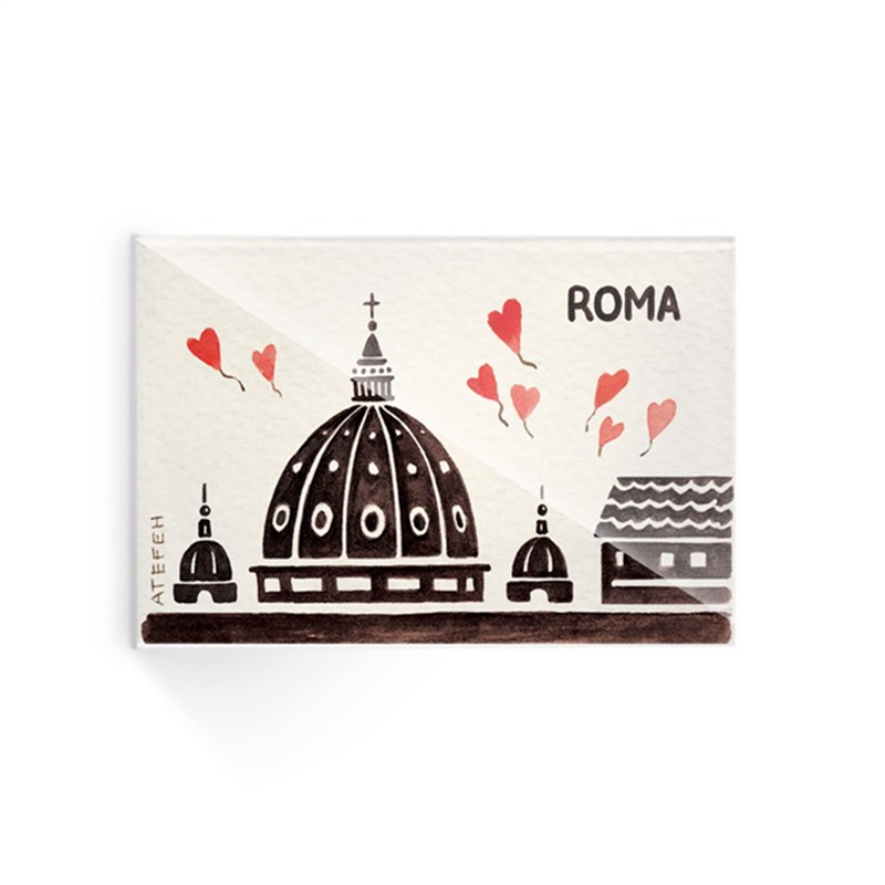 Calamita rettangolare 7x5 cm raffigurante una romantica vista della cupola di San Pietro a Roma, circondata da cuori stilizzati. Un souvenir perfetto per ricordare l'atmosfera unica della citt� eterna, parte della Selezione Vertecchi.