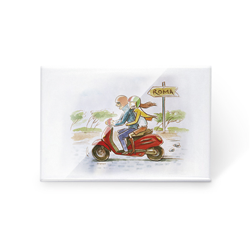 Calamita rettangolare 7x5 cm raffigurante una romantica scena di innamorati in scooter tra le vie di Roma. Un souvenir perfetto per ricordare la magia della Citt� Eterna, parte della selezione Vertecchi.