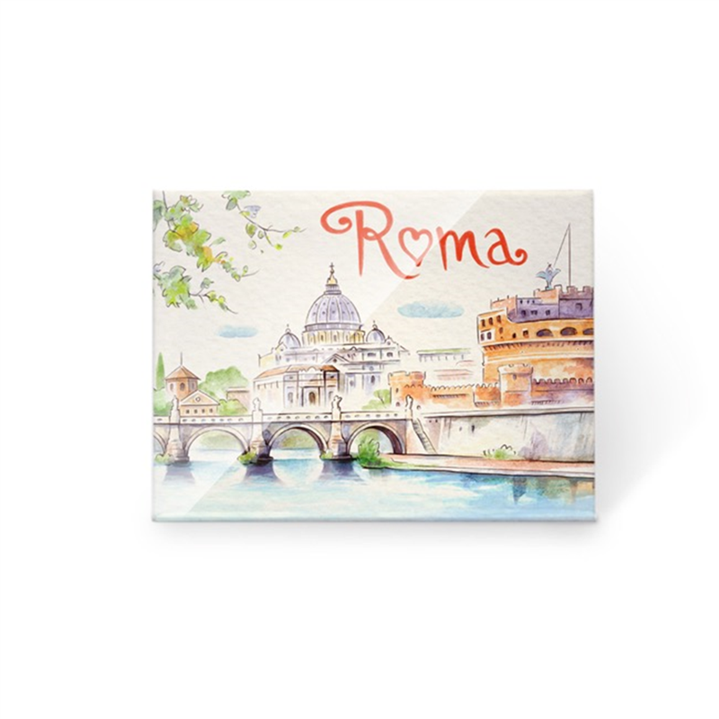 Calamita rettangolare 7x5 cm raffigurante un incantevole panorama di Roma con il fiume Tevere in primo piano. Parte della selezione Vertecchi, questo souvenir cattura l'essenza della Citt� Eterna, ideale per arricchire la tua collezione o come regalo speciale.