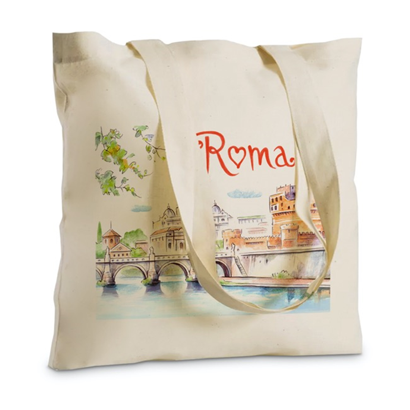Shopper in cotone 42x42 cm con motivo "Roma-Panorama e Tevere", parte della Selezione Vertecchi. Design elegante che cattura la bellezza della citt� eterna e del suo iconico fiume, ideale per portare un tocco di Roma ovunque.