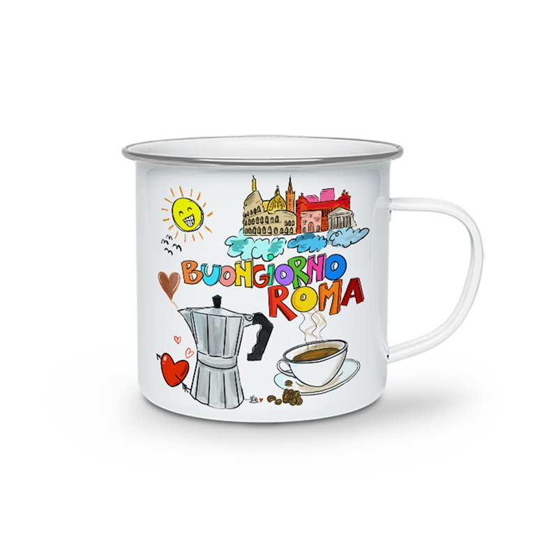 Tazza in alluminio leggera e resistente, decorata con il testo "Buongiorno Roma". Parte della Selezione Vertecchi, ideale per gli amanti della citt� eterna che desiderano un pezzo unico e funzionale per iniziare la giornata con stile. Perfetta per gustare bevande calde o fredde, con un design che celebra il fascino romano.