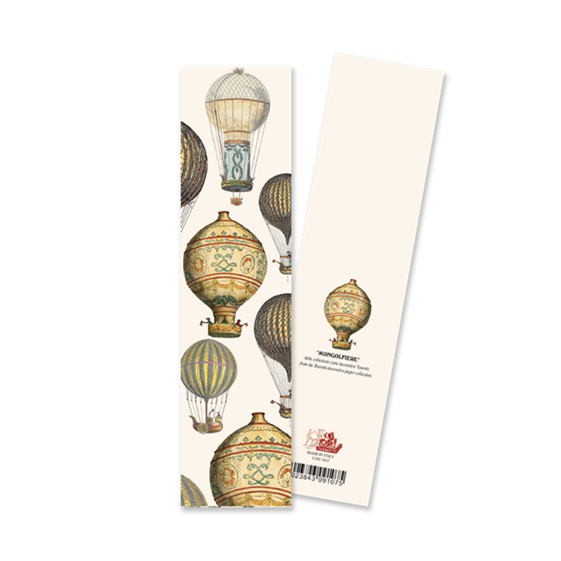 Segnalibro in cartoncino avorio da 300 gr, dimensioni 5x20 cm, decorato con eleganti illustrazioni di mongolfiere. Prodotto da Tassotti, sinonimo di qualità e design raffinato. Perfetto per arricchire la tua lettura con un tocco di originalità e stile.