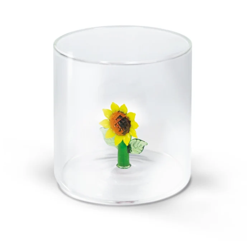 illumina la tua tavola con questo bicchiere artigianale in vetro borosilicato, impreziosito da una decorazione interna a forma di girasole. con una capienza di 250 ml, è perfetto per acqua, succhi, tè o altre bevande, combinando estetica e praticità.