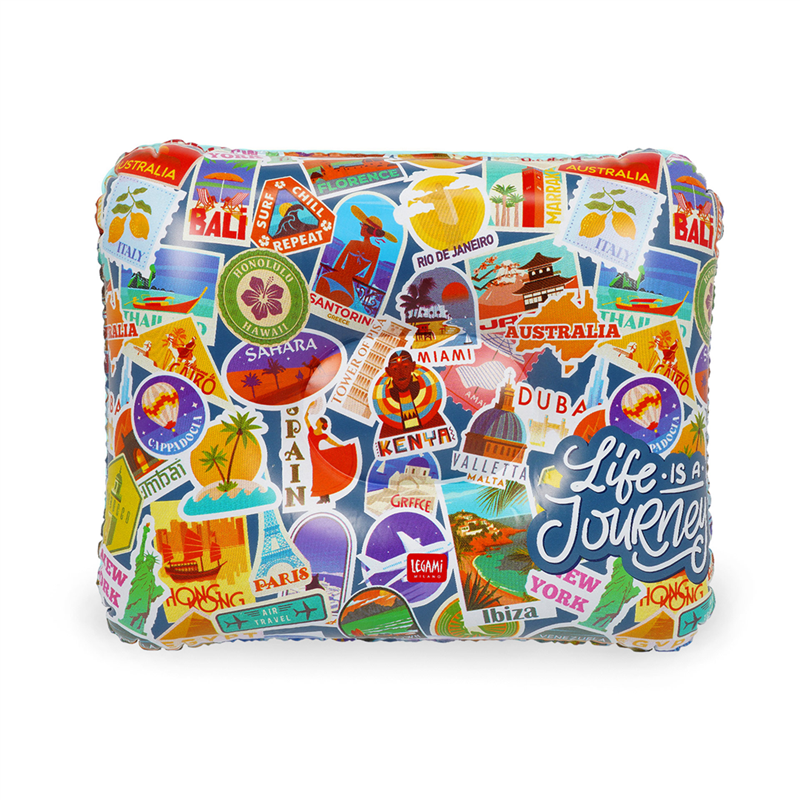 il cuscino gonfiabile "inflatable pillow travel stickers" di legami � un accessorio da viaggio pratico e confortevole, ideale per chi desidera riposare durante i viaggi. realizzato con materiali di alta qualit�, offre un supporto ottimale per testa e collo. il design � caratterizzato da vivaci adesivi da viaggio che lo rendono non solo funzionale ma anche esteticamente piacevole. facile da gonfiare e sgonfiare, � compatto e leggero, perfetto per essere riposto nel bagaglio senza occupare spazio eccessivo.