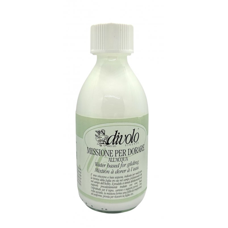Missione Per Doratura All'Acqua Ml.250 è un adesivo a base d'acqua progettato per l'applicazione di foglie d'oro e altri metalli sottili su superfici preparate. La sua formulazione garantisce un tempo di lavorazione adeguato e una forte adesione, rendendolo ideale per progetti di decorazione e restauro. Si applica facilmente con un pennello morbido e si asciuga in modo trasparente, garantendo un aspetto professionale. È consigliabile utilizzarlo su superfici pulite e asciutte per ottenere i migliori risultati.
