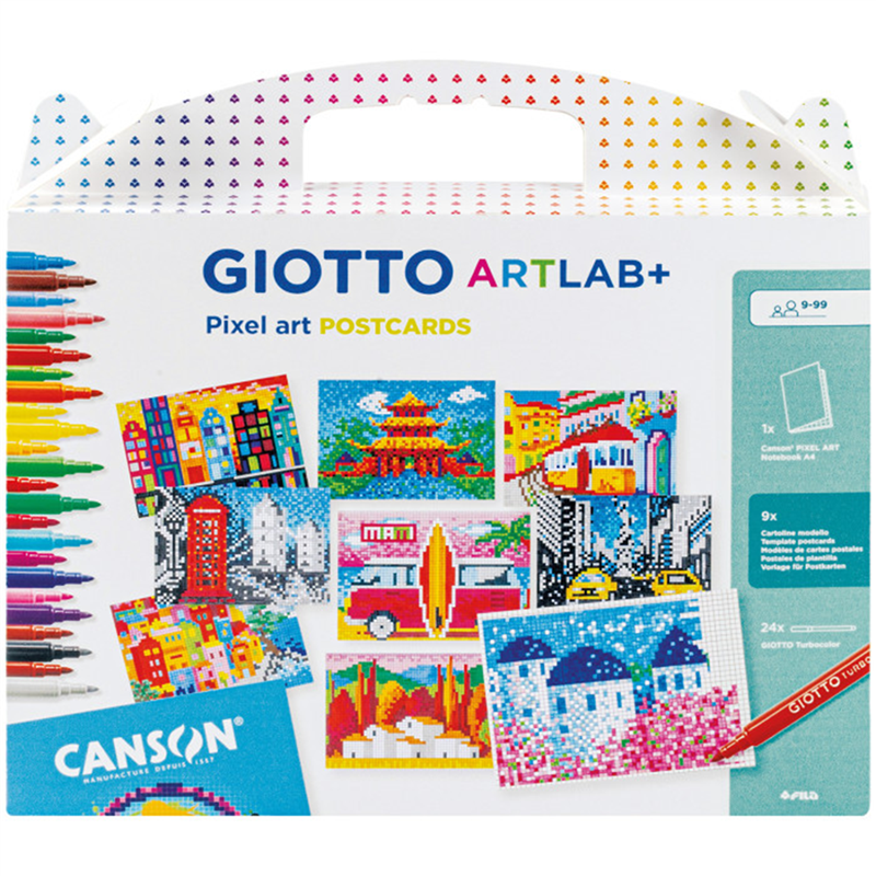 l'arte di creare immagini dettagliate e colorate attraverso l'uso di quadratini chiamati "pixel". con questa confezione speciale è possibile dare vita a cartoline con paesaggi unici e citta iconiche. tutto grazie ai pennarelli turbo color e all'album canson pixel art notebook. un modo divertente e creativo e innovativo per esplorare l'arte digitale.