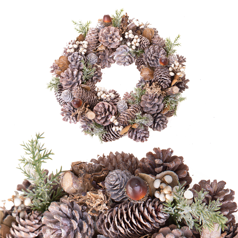La Corona D36cm è una decorazione elegante e naturale, caratterizzata da pigne, ghiande e piccoli legnetti. È impreziosita da un effetto "Natural Ice" e glitter che aggiunge un tocco di brillantezza e raffinatezza, ideale per abbellire ambienti interni in occasione delle festività. Con un diametro di 36 cm, questa corona si presenta come un elemento decorativo versatile, perfetto per porte, pareti o tavoli, donando un'atmosfera accogliente e festosa.
