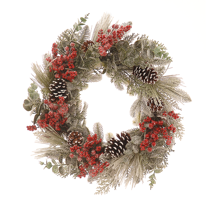 Corona decorativa con un diametro di 60 cm, realizzata in pino innevato e arricchita con pigne e bacche rosse. Perfetta per aggiungere un tocco natalizio e accogliente agli ambienti domestici.