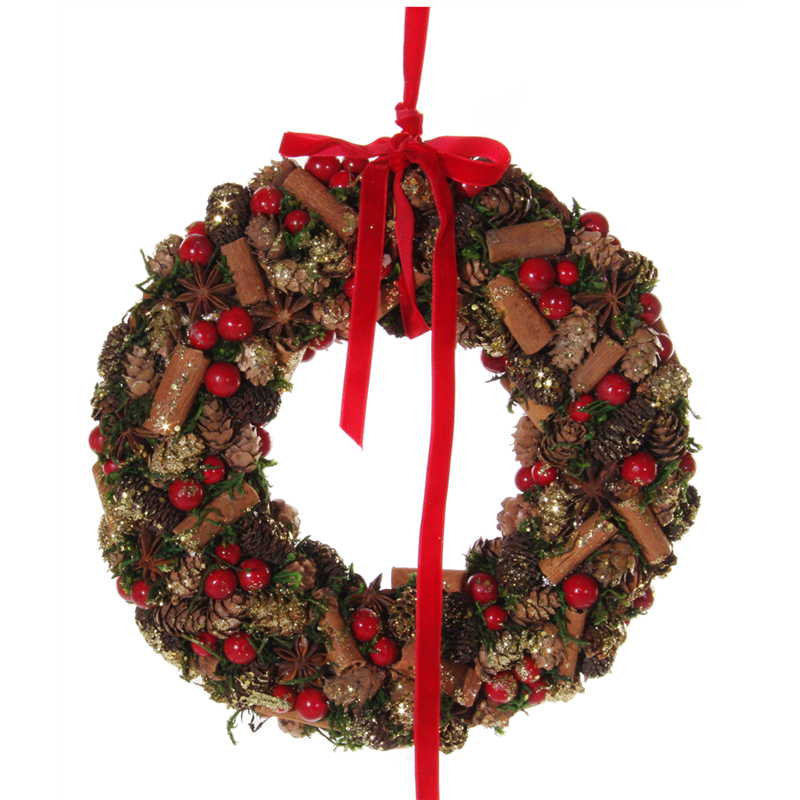 Corona decorativa dal diametro di 25 cm, arricchita con spezie e bacche rosse glitterate, ideale per aggiungere un tocco festivo ed elegante a qualsiasi ambiente.