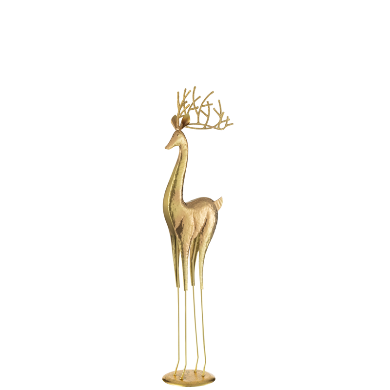 Renna decorativa in metallo con finitura dorata, caratterizzata da un design allungato. Misura 71 cm di altezza, ideale per aggiungere un tocco elegante e festoso all'arredamento. Perfetta per decorazioni natalizie o per arricchire l'ambiente con un elemento stilizzato e moderno.