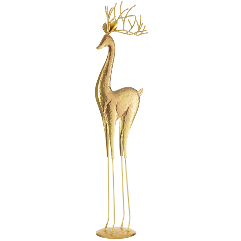 Renna decorativa in metallo di colore oro, con un design allungato e un'altezza di 92 cm. Perfetta per aggiungere un tocco elegante e festoso all'arredamento durante le festività natalizie.