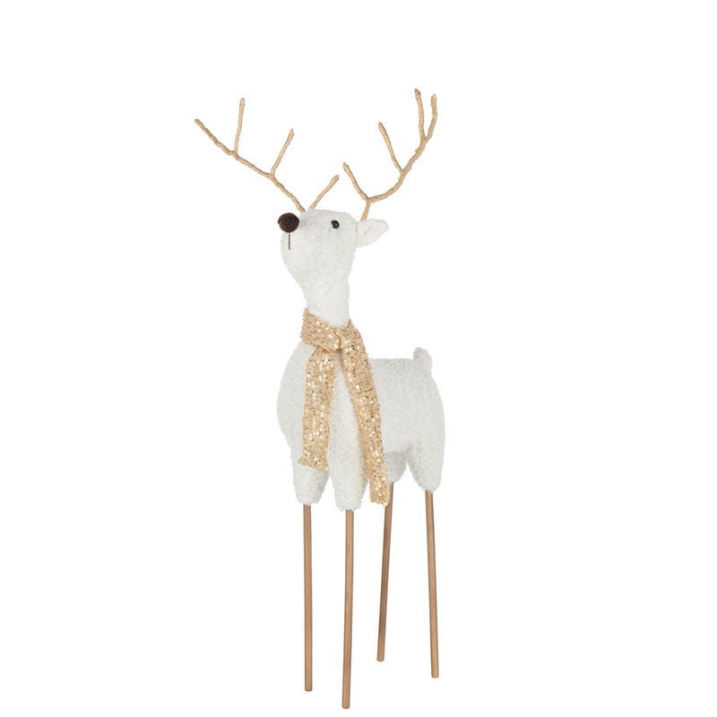 Renna decorativa alta 75 cm, realizzata con finitura nei toni del bianco e oro. Indossa una sciarpa, aggiungendo un tocco elegante e festoso al design. Perfetta per arricchire l’atmosfera natalizia con stile e raffinatezza.