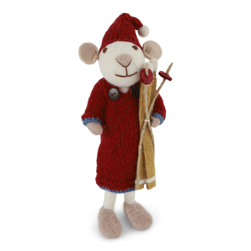 Topolina indossa un elegante vestito rosso, caratterizzato da un design vivace e dettagli accurati. Gli sci marroni che tiene con sé aggiungono un tocco di avventura, suggerendo un perfetto equilibrio tra stile e sportività.