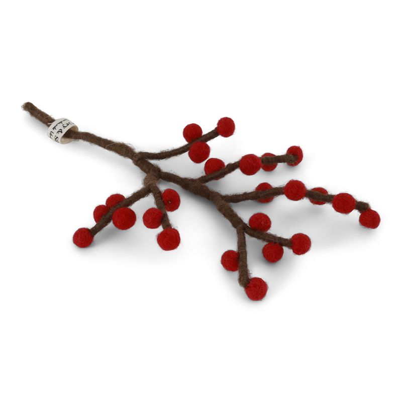 Ramo decorativo in feltro marrone con bacche rosse, ideale per aggiungere un tocco naturale e festoso agli ambienti interni. Realizzato artigianalmente con materiali di alta qualità, è perfetto per composizioni natalizie o come elemento di design per tutto l'anno.