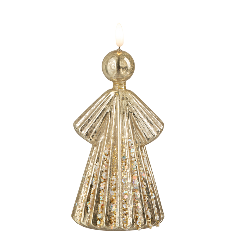 Angelo decorativo in vetro con dettagli dorati, dotato di illuminazione a LED integrata. Ha un'altezza di 21,5 cm, ideale per aggiungere un tocco elegante e luminoso a qualsiasi ambiente.