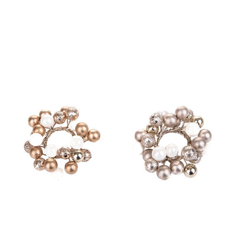 corona girocandela decorativa con diametro di 8 cm, arricchita da perle e palline nei toni oro e champagne. ideale per aggiungere un tocco elegante e sofisticato a qualsiasi ambiente, perfetta come centrotavola o decorazione natalizia.
