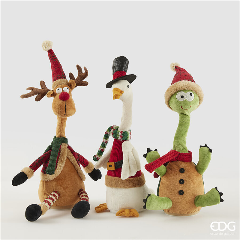 carillon peluche a forma di renna con dettagli tartan e oca, parte della collezione swirl di enzo de gasperi. alto 38 cm, combina musica e movimento per un'esperienza rilassante e decorativa.