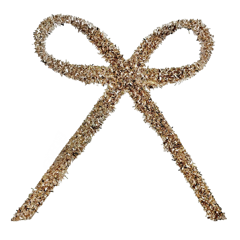 Fiocco decorativo in champagne glitter con clip, dimensioni 25 cm, perfetto per arricchire e illuminare ambienti festivi con un tocco elegante e scintillante.
